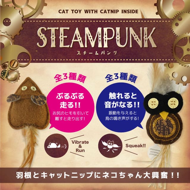 Pickup ピックアップ HOMEピックアップスチームパンク 猫おもちゃ スチームパンク ぶるぶる動く!おもちゃにすりすり!ちょっと噛んだり! ・おしりについている紐を引っ張ると、ぶるぶる動くおもちゃです。・動くおもちゃにネコちゃんの興味を引き寄せます。 カタログダウンロード 商品一覧 ピックアップに戻る